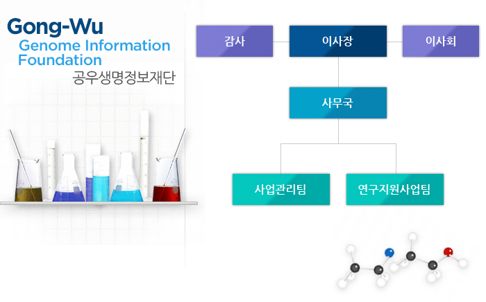 공우생명정보재단은 2017년 현재 이사장 및 상임이사를 포함한 이사진 및 연구지원사업팀으로 구성되어 있습니다. 자세한사항은 아래 조직도를 참고하시기 바랍니다.